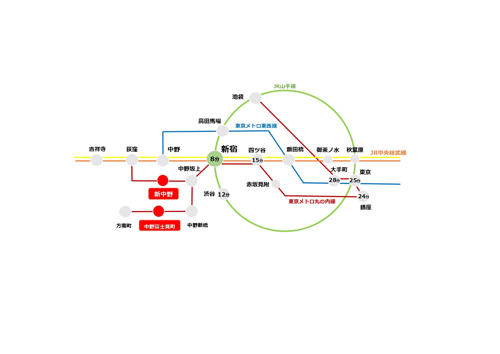 新中野駅、中野富士見町駅エリアは東京メトロ丸ノ内線が利用可能で、「東京」駅や「大手町」駅をはじめ、「新宿」駅、「銀座」駅といった主要ターミナル駅へダイレクトアクセスが可能であり、都心各所への交通利便性に優れるエリアです。